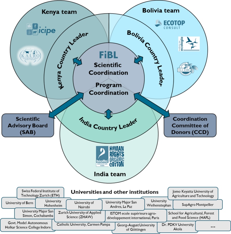 Program coordination largely consists of steering, implementation and control of the overall program and the embedded three project sites (Bolivia, India and Kenya). The overall coordination of the program and the projects is realised by the international program coordinator (FiBL). In addition, local implementing partners at the project site supporting FiBL with the establishment and maintenance of the project activities. The program coordinator (FiBL) receive funds for their respective activities from four different donors. Together with FiBL, the donors form a Coordination Committee of Donors (CCD), which takes strategic decisions regarding future plans for the program and it monitors progress at the level of impact chains. As a scientific backstop FiBL established different Scientific Advisory Boards (SAB) at program and project level which are completed by collaborating institutions.